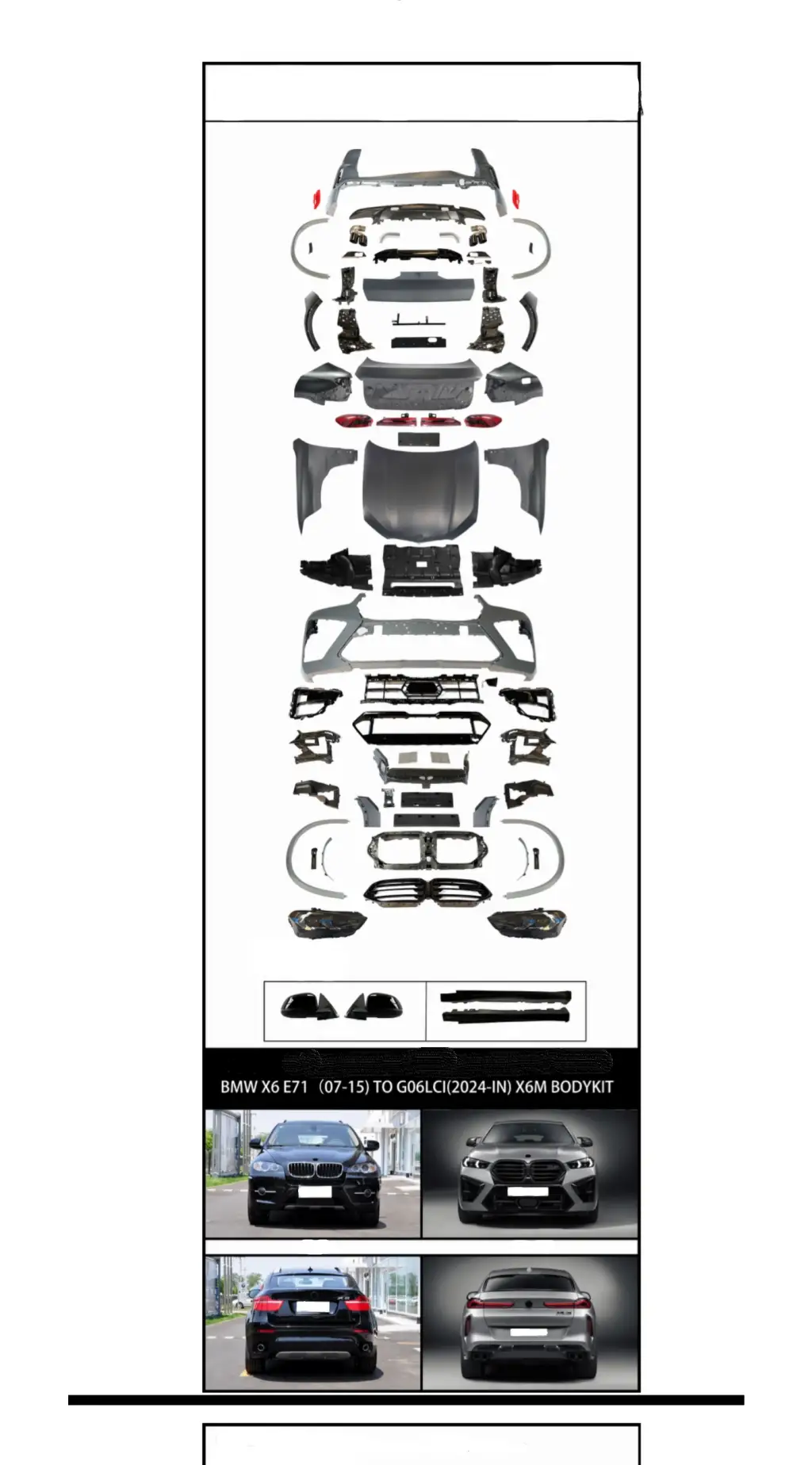 Komple Gövde Kiti X6:E71 [DONUSUM => X6:G06-LCI] <OO-OO> Egz.Çıkışlı, Panj-lu, Egz.Uçlu, Kaput/Çamurluk/Bagaj Kap., Far/Stop, Çamurluk Dodikleri -X6M- 2008-14